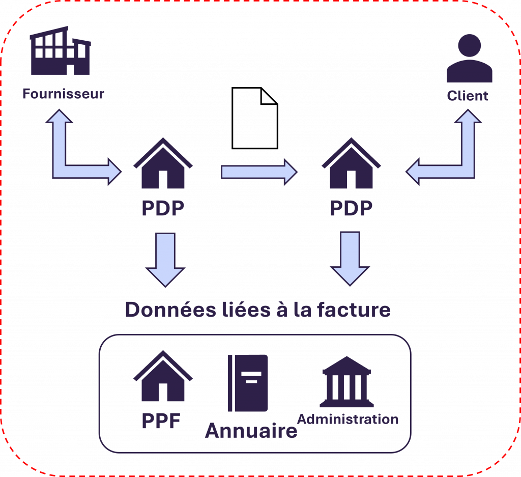 • Transmission des données : La PDP joue un rôle central en collectant, enrichissant et transmettant les données liées aux factures aux différents acteurs (PPF, annuaires, administration, etc.). Cela centralise les informations et garantit leur conformité tout au long du processus.