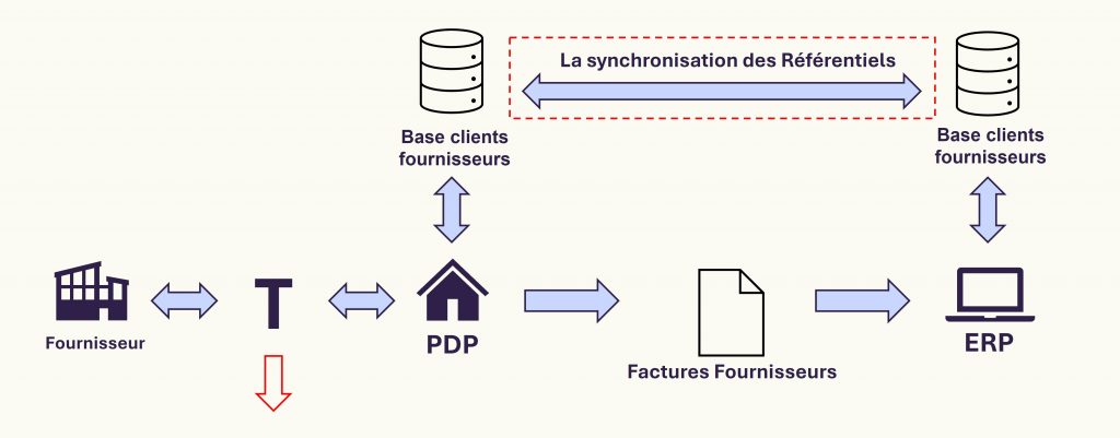 Comme illustré, la synchronisation des référentiels entre la base clients et fournisseurs, bien qu’optionnelle, renforce l’uniformité des données, simplifiant les traitements de factures et minimisant les erreurs.